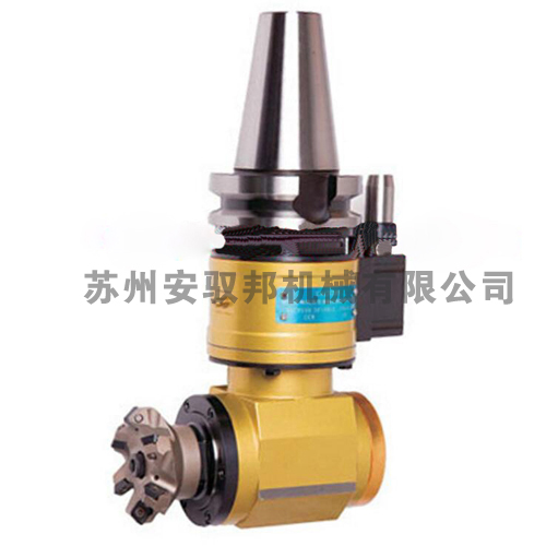 角度頭是一種機床附件,機床安上角度頭后刀具旋轉中心線可以與主軸旋轉中心線成角度加工工件。原產于歐洲,現已廣泛應用于航空、汽車、模具等機械加工的各個領域。使用角度頭,無需改變機床結構就可以增大其加工范圍和適應性,使一些用傳統方法難以完成的加工得以實現,并能減少工件重復裝夾,提高加工精度和效率。主要用于立式或臥式加工中心、鏜床、龍門銑床等,其中輕型可以裝在刀庫中,并可以在刀庫和機床主軸之間自由轉換;中型及重型擁有較大的剛性和扭矩,可適用于重切削加工需求。因角度頭擴充了機床的使用性能,相當于給機床增加了一根軸,甚至在某些大型工件不易翻轉或是高精度要求的情況下,比第四軸更實用。 FM型面銑刀專用小型90度直角銑頭它的特點是具備傳統角度頭的特點,本體與角度頭可360度自由回轉;可直接連接面銑刀,加工快速穩定;可自動換刀,是提高效率、批量生產必備的工具。